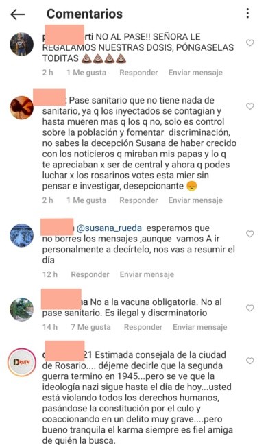 Ante esto, en las redes sociales de la concejala y también en las institucionales del Concejo, un grupo de personas comenzó a hostigar a Rueda acusándola de promover una “pase nazi”. “La manifestación fue realizada en simultáneo recurriendo a argumentos falaces, donde se tergiversó el sentido de una iniciativa, que busca poner en valor y mejorar la utilización del certificado de vacunas para aquellas personas que voluntariamente se inscribieron para recibirla”, detalló.