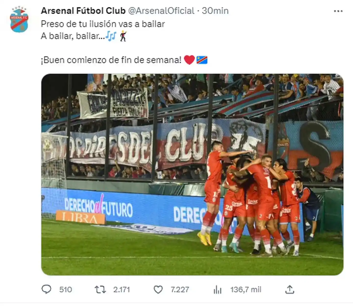 Minutos después, la cuenta oficial de Arsenal publicó un tuit donde se puede ver a los jugadores celebrando el gol de ayer ante el Xeneize con la leyenda: “Preso de tu ilusión vas a bailar A bailar, bailar…”.