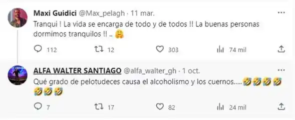 Ahora, Alfa descubrió viejos tweets de Maxi contra él (son de febrero y marzo de este año) y le respondió en la red social. En uno de ellos, Alfa le responde: “¿Cómo andás, borracho? ¿Todo bien? ¡¡¡No salió el trío!!! ¿Qué cagada, no? Cami te mandó al horno con papitas. Zarpaaaado culeado!!!!”.