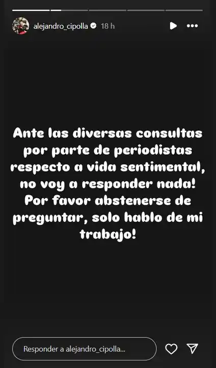 Por otra parte, Alejandro Cipolla tomó la posta y contestó a la acusación en sus redes sociales: “Ante las diversas consultas por parte de periodistas respecto a mi vida sentimental, no voy a responder nada!”.