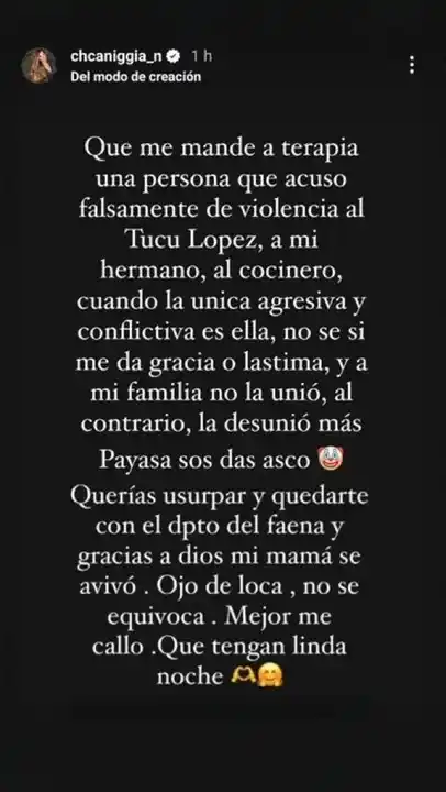 “Querías usurpar y quedarte con el depto del Faena y gracias a dios mi mamá se avivó. Ojo de loca, no se equivoca. Mejor me callo. Que tengan una linda noche”, cerró.
