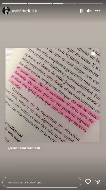 “El amor sano no se trata de necesitar el otro, sino de desearlo. De saber que sin esa persona, alguien podría vivir igual, pero que, aún así, elige hacerlo con ella”, escribió Gabriel Rolón. Cande Tinelli eligió esa cita del libro del psicólogo para referirse a su relación actual.