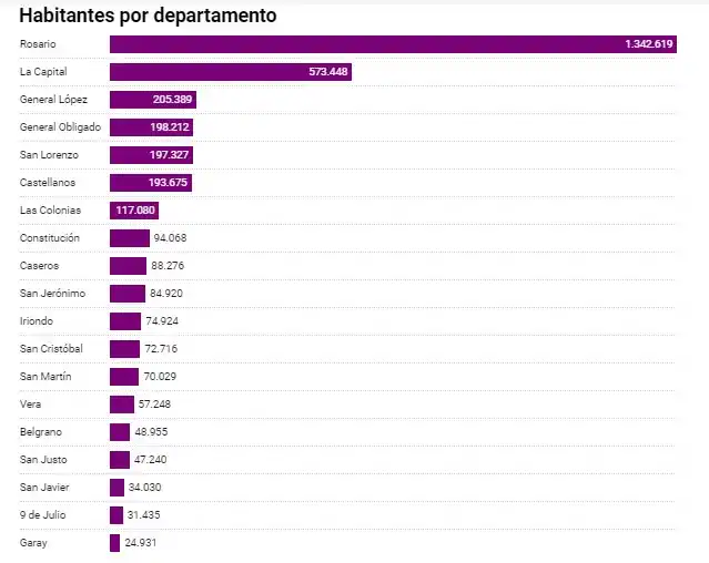 El departamento más poblado sigue siendo Rosario (1.342.619), seguido por La Capital (573.448) y General López (205.389).