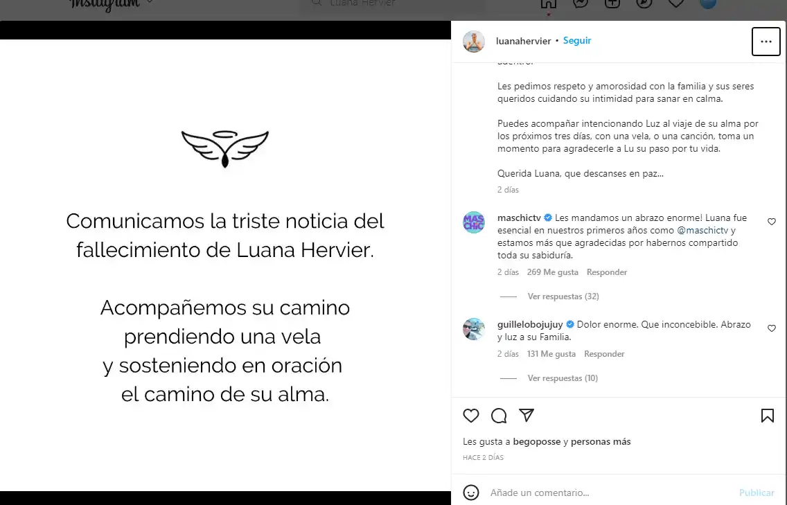 Una publicación de Instagram conmovió a sus más de 100 mil seguidores. Allí puede leerse: “Comunicamos la triste noticia del fallecimiento de Luana Hervier. Acompañemos su camino prendiendo una vela y sosteniendo en oración el camino de su alma”, precisó el comunicado de la familia.