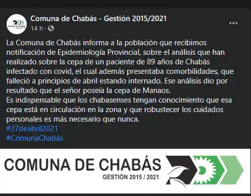 En un comunicado publicado en la cuenta de Facebook se indicó que la comuna de Chabás recibió una notificación “por parte de Epidemiología Provincial respecto al análisis que fue realizado sobre la cepa de un paciente de 89 años de la localidad infectado con Covid 19. Dicho análisis dio por resultado que el hombre poseía la cepa de Manaos”.