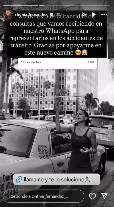 Por otra parte, la mediática celebró el extenso número de personas que se contactaron con ella para su nuevo proyecto: “Wuau. Esta es la cantidad de consultas que vamos recibiendo en nuestro WhatsApp para representarlos en los accidentes de tránsito. Gracias por apoyarme en este nuevo camino”, escribió en una historia de Instagram.