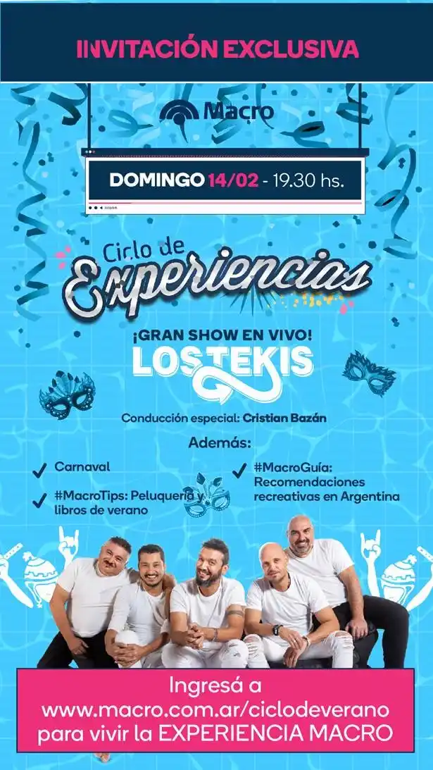 Conectáte en www.macro.com.ar/ciclodeverano y disfruta del Carnaval de Los Tekis desde cualquier dispositivo: celular, Tablet, PC o Smart TV en la comodidad de tu estadía de verano.