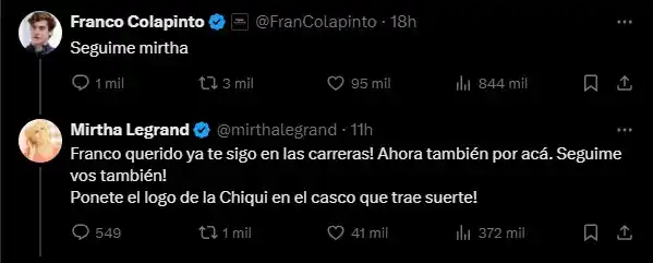 Sin embargo, la historia continuó y es que la oriunda de Villa Cañas le contestó: “¡Franco querido, ya te sigo en las carreras! Ahora también por acá. ¡Seguime vos también!”. Y concluyó con un curioso pedido: “Ponete el logo de la Chiqui en el casco que trae suerte".