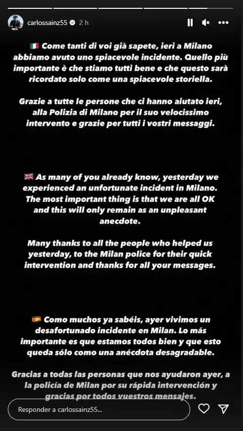 Sainz publicó en las redes sociales: "Como muchos de vosotros ya sabéis, ayer sufrimos un desafortunado incidente en Milán. Lo más importante es que todos estamos bien y esto sólo quedará como una desagradable anécdota".