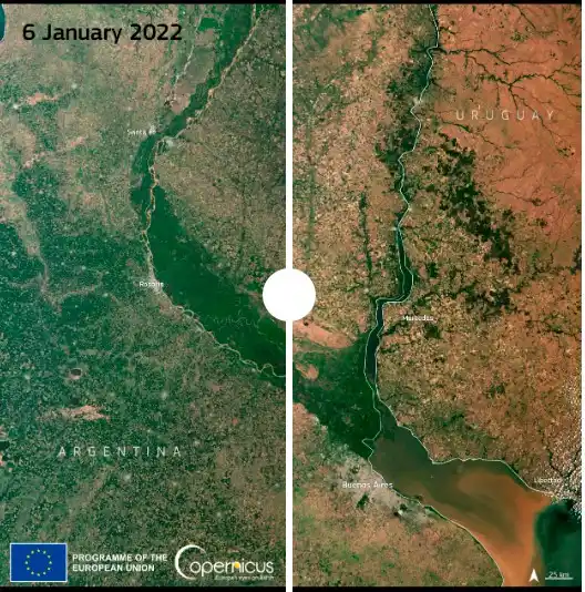 Se trata de la contraposición de una foto satelital del Delta del Paraná del 8 de enero con otra del 6 de enero de 2022. Tomadas por los satélites Copernicus Sentinel-3, muestran el impacto de la sequía en la región, especialmente en las provincias de Santa Fe y Entre Ríos.