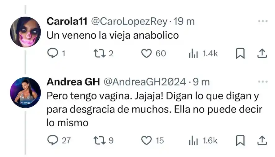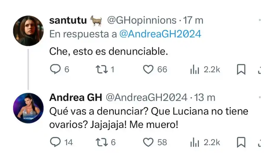 Los dichos, que tuvieron amplia circulación en la red social, no fueron aislados. Andrea realizó una serie de publicaciones en tono burlesco y despectivo en respuesta a otros usuarios que la cuestionaban, y en cada intervención profundizó los estigmas contra Luciana. En uno de esos mensajes llegó a afirmar: “Pero tengo vagina. Jajaja. Digan lo que digan y para desgracia de muchos. Ella no puede decir lo mismo”. En otro, desestimó las críticas diciendo: “¿Qué vas a denunciar? ¿Que Luciana no tiene ovarios? Jajajaja. ¡Me muero!”.