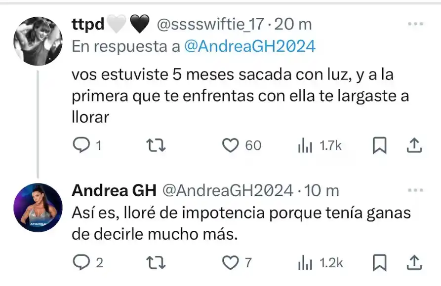 Por su parte, Andrea no mostró señales de retractación. En otra de sus respuestas, admitió que durante un cruce televisado con Luz, una de las aliadas de Luciana, se quebró emocionalmente, pero relativizó el episodio diciendo: “Así es, lloré de impotencia porque tenía ganas de decirle mucho más”.