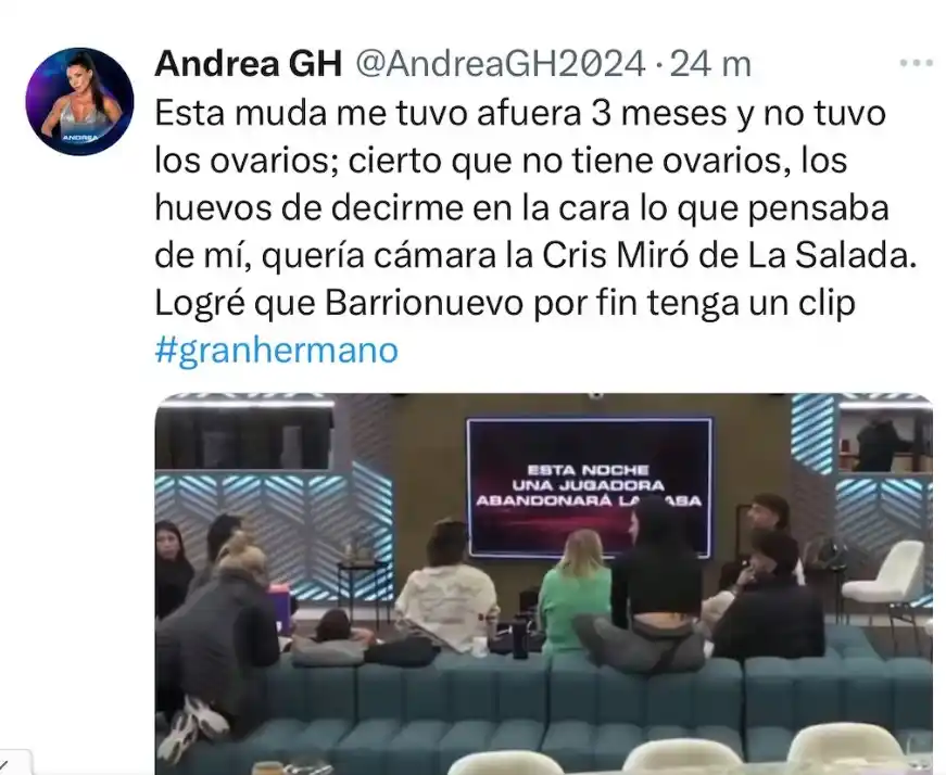 En el tuit que generó una ola de repudios, Andrea escribió: “Esta muda me tuvo afuera 3 meses y no tuvo los ovarios; cierto que no tiene ovarios, los huevos de decirme en la cara lo que pensaba de mí, quería cámara la Cris Miró de La Salada”, en alusión directa a la participante nacida en Pico Truncado, Santa Cruz, y que se convirtió en la primera mujer trans en la historia del programa en esta nueva etapa conducida por Santiago del Moro.