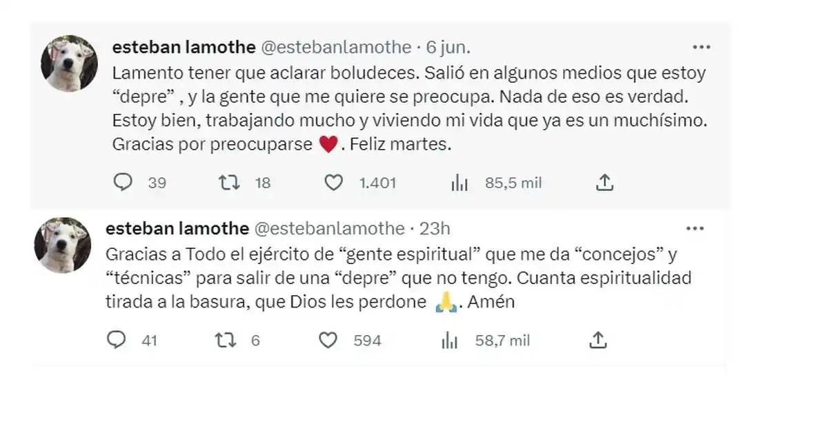 “Lamento tener que aclarar boludeces. Salió en algunos medios que estoy depre, y la gente que me quiere se preocupa. Nada de eso es verdad. Estoy bien, trabajando mucho y viviendo mi vida que ya es un muchísimo. Gracias por preocuparse. Feliz martes”, explicó Esteban Lamothe.