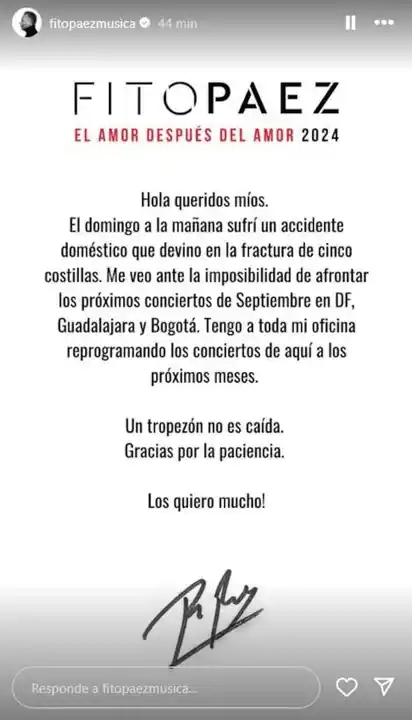 En otro de los comunicados que publicó, Páez informó que la decisión fue tomada tras la evaluación de médicos especialistas que le exigieron reposo absoluto. Según la productora, los shows serán reprogramados.