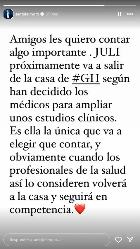Este martes, Santiago del Moro confirmó en su Instagram que Furia dejará la casa de Gran Hermano por orden del médico. "Amigos quiero comentarles algo importante. Juli próximamente va a salir de la casa de Gran Hermano, según han decidido los médicos para ampliar unos estudios clínicos", comenzó diciendo.