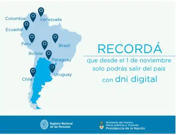 Según la normativa migratoria vigente, los argentinos de los estados del Mercosur y sus países asociados -entre ellos, Brasil, Paraguay, Uruguay, Bolivia, Chile, Colombia, Ecuador, Perú, Venezuela- pueden viajar y salir del país por vía aérea, terrestre, marítima o fluvial tanto con el pasaporte nacional como con el DNI digital en su formato tarjeta.