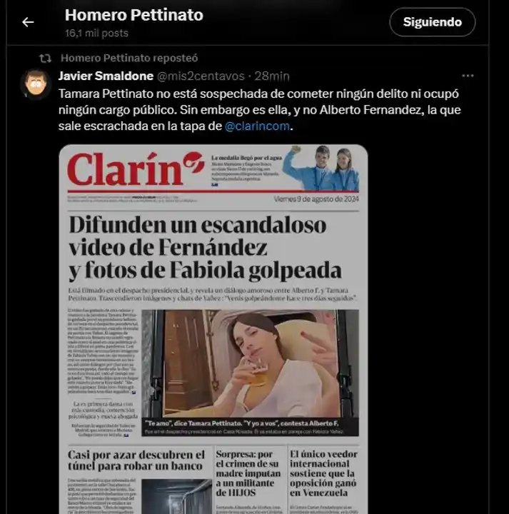 “Tamara Pettinato no está sospechada de cometer ningún delito ni ocupó ningún cargo público. Sin embargo es ella, y no Alberto Fernández, la que sale escrachada en la tapa de Clarín”, dice el mensaje que compartió Homero.