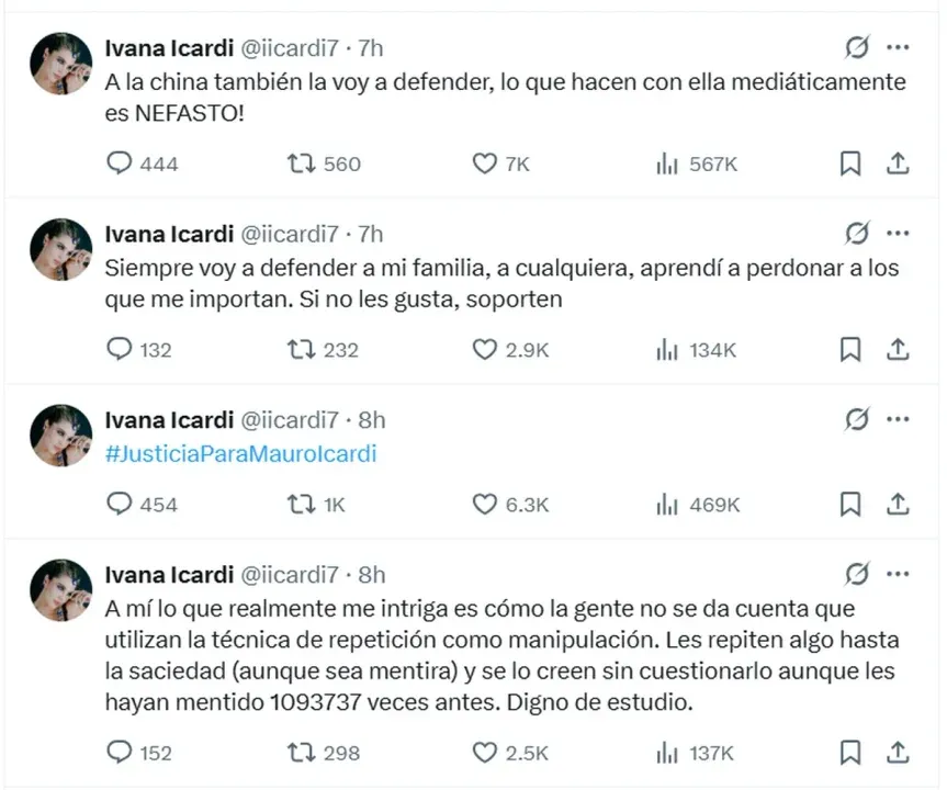 “Ahora ya se imaginan lo que yo viví”, comenzó Ivana para luego dar las razones de su enojo con la “Bad Bitch”: “A mí lo que realmente me intriga es cómo la gente no se da cuenta de que utilizan la técnica de repetición como manipulación. Les repiten algo hasta la saciedad (aunque sea mentira) y se lo creen sin cuestionarlo aunque les hayan mentido 1093737 veces antes. Digno de estudio”, criticó indirectamente para luego sumarse al hashtag #JusticiaParaMauroIcardi.