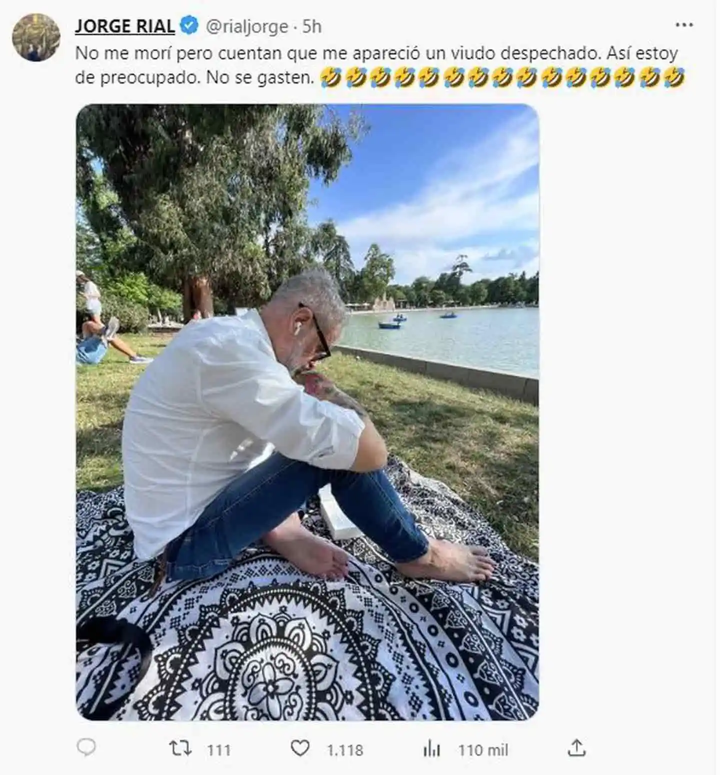 “No me morí, pero cuentan que me apareció un viudo despechado. Así estoy de preocupado. No se gasten”, escribió junto a una foto donde se lo ve sentado en un parque frente a un lago leyendo un libro.