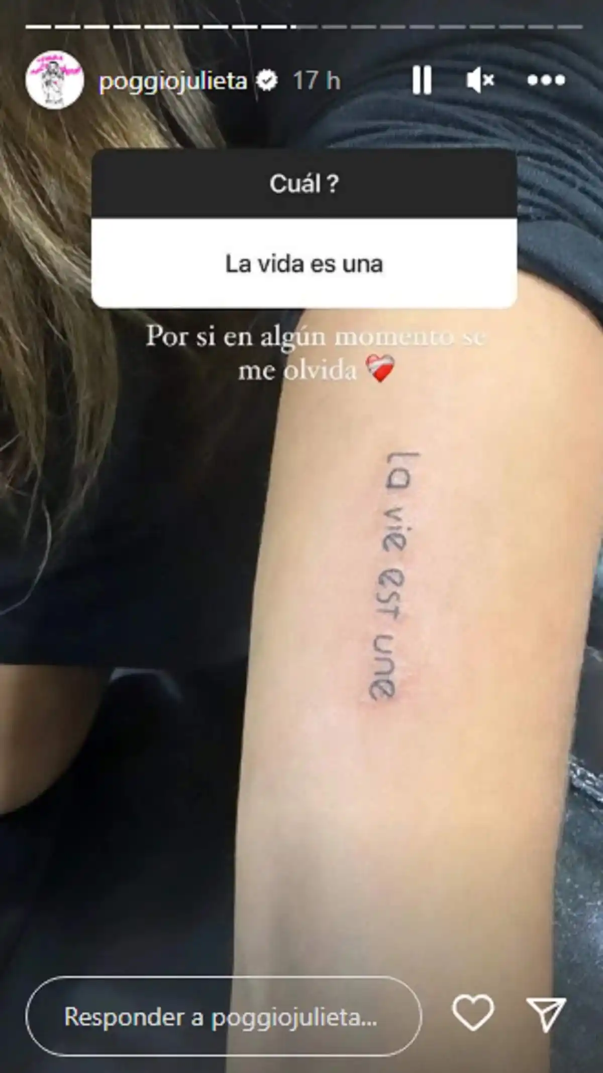 Entonces, llegó la respuesta correcta. “La vida es una”, escribieron del otro lado y Julieta Poggio respondió con la frase escrita en francés tatuada en su brazo. “Por si en algún momento se me olvida”, agregó junto a la imagen y sumó un corazón con una venda, dando a entender que tiene su corazón lastimado y que está sanando.