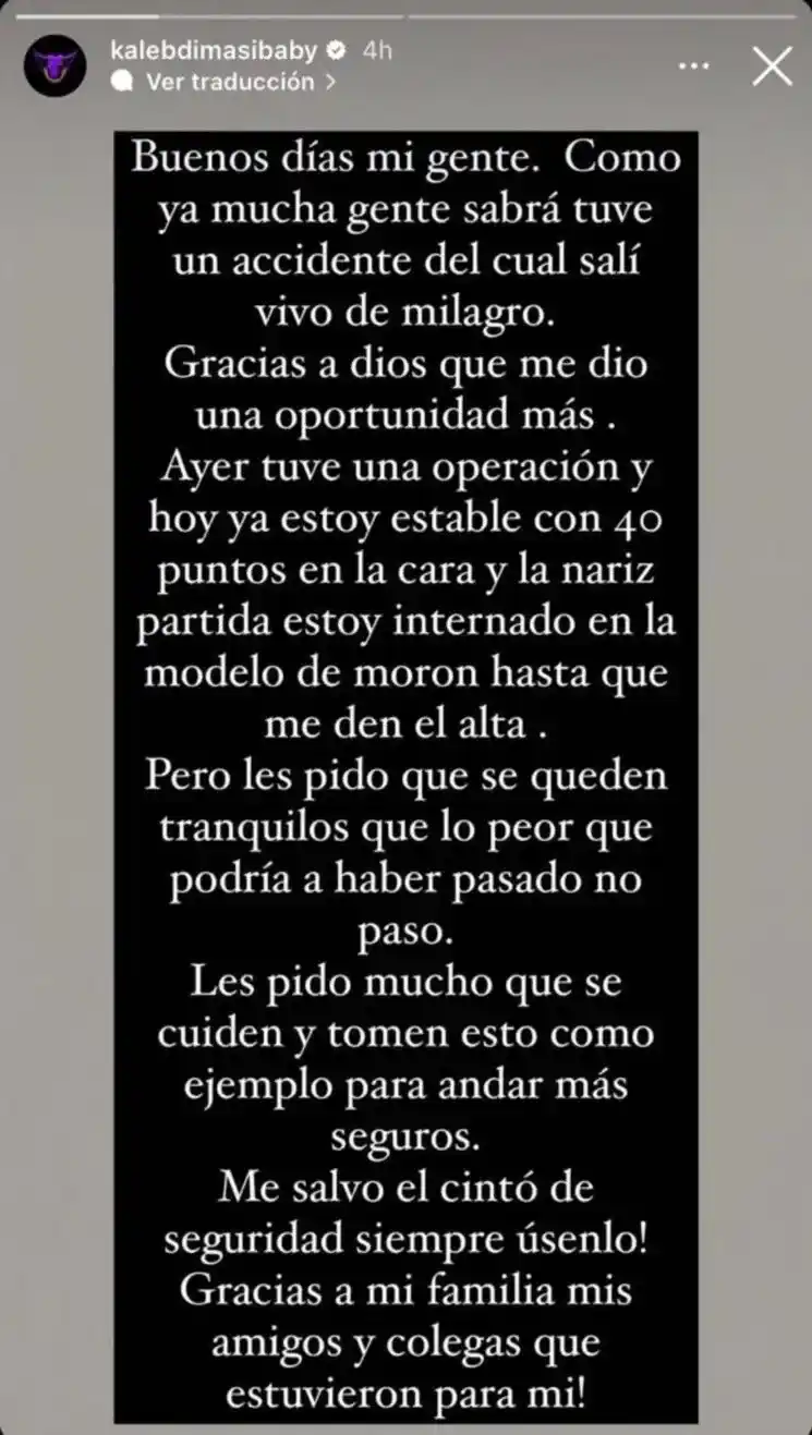 “Buenos días mi gente. Como ya mucha gente sabrá tuve un accidente del cual salí vivo de milagro. Gracias a dios que me dio una oportunidad más”, comenzó diciendo el artista en el comunicado que realizó en su cuenta oficial de Instagram.