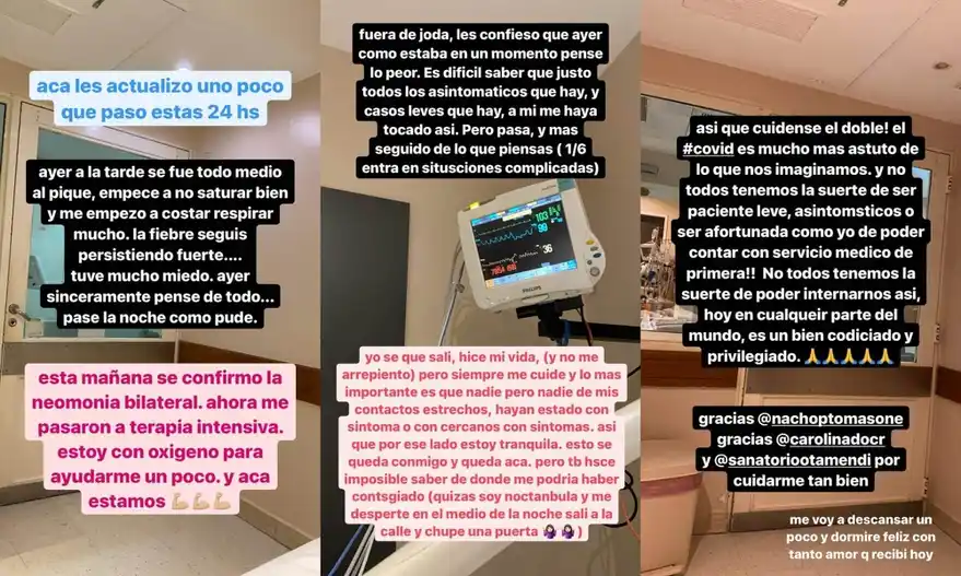 “Acá les actualizo un poco lo que pasó en estas 24hs. Ayer por la tarde se fue todo medio al pique. Empecé a no saturar bien, me costaba respirar mucho y la fiebre seguía persistiendo fuerte… Tuve mucho miedo. Ayer sinceramente pensé de todo y pasé la noche como pude”, contó a través de una serie de historias. “Esta mañana se confirmó la neumonía bilateral y ahora me pasaron a terapia intensiva. Estoy con oxígeno para ayudarme un poco”.