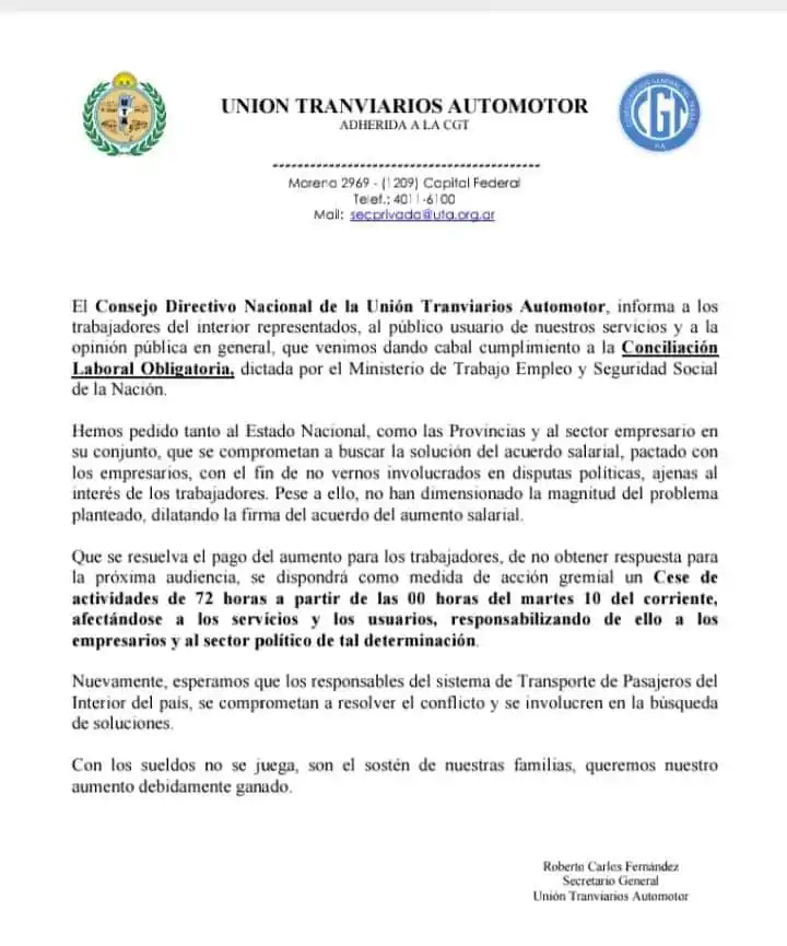 Para el gremio que nuclea a los choferes, las autoridades políticas y empresarias “no han dimensionado la magnitud del problema planteado, dilatando la firma del acuerdo del aumento salarial”. “Que se resuelva el pago del aumento para los trabajadores, de no obtener respuesta para la próxima audiencia, se dispondrá como medida de acción gremial un cese de actividades de 72 horas a partir de las 00 horas del martes 10 del corriente”, alertó UTA. Además, responsabilizó “a los empresarios y al sector político de tal determinación”. UTA también apuntó contra los gobiernos provinciales y municipales del interior del país. “Nuevamente, esperamos que los responsables del sistema de transporte de pasajeros del interior se comprometan a resolver el conflicto y se involucren en la búsqueda de soluciones”, señaló el gremio en el comunicado.