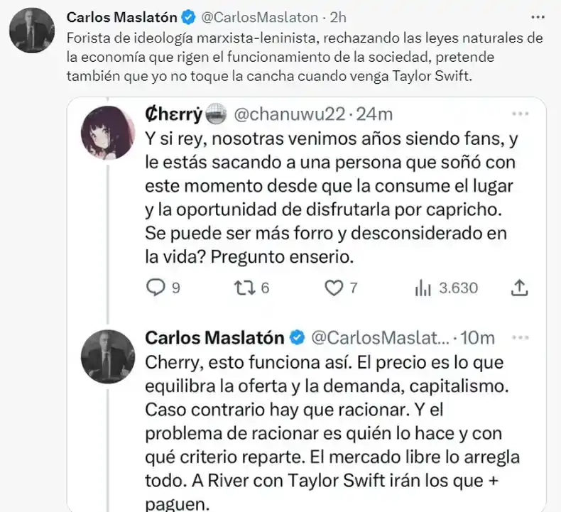“Cherry, esto funciona así. El precio es lo que equilibra la oferta y la demanda, capitalismo. Caso contrario hay que racionar. Y el problema de racionar es quién lo hace y con qué criterio reparte. El mercado libre lo arregla todo. A River con Taylor Swift irán los que más paguen”, retrucó Maslatón.