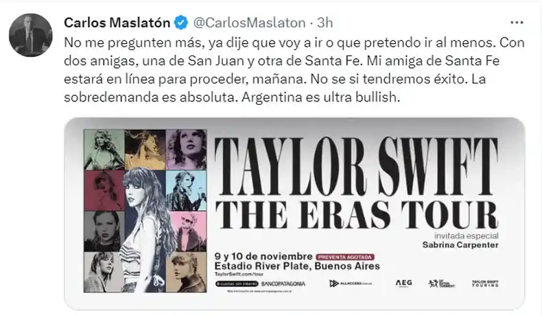 Todo comenzó cuando Maslatón confirmó que haría lo posible para conseguir entradas para ir al show con dos amigas. “No me pregunten más, ya dije que voy a ir o que pretendo ir al menos. Con dos amigas, una de San Juan y otra de Santa Fe. Mi amiga de Santa Fe estará en línea para proceder, mañana. No se si tendremos éxito. La sobredemanda es absoluta. Argentina es ultra bullish”, escribió en su Twitter.