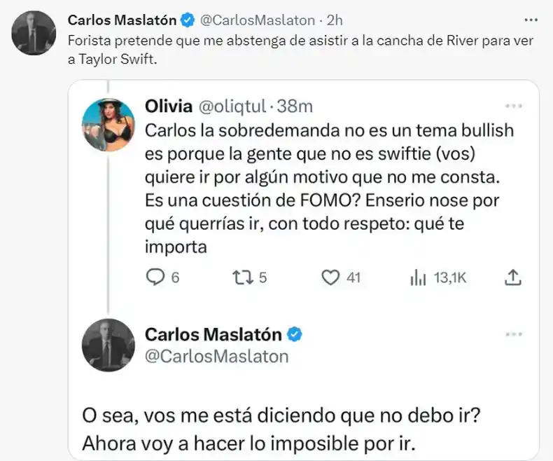“Carlos la sobredemanda no es un tema bullish es porque la gente que no es swiftie (vos) quiere ir por algún motivo que no me consta. Es una cuestión de FOMO? Enserio no sé por qué querrías ir, con todo respeto: qué te importa”, le escribió una usuaria de la red social.