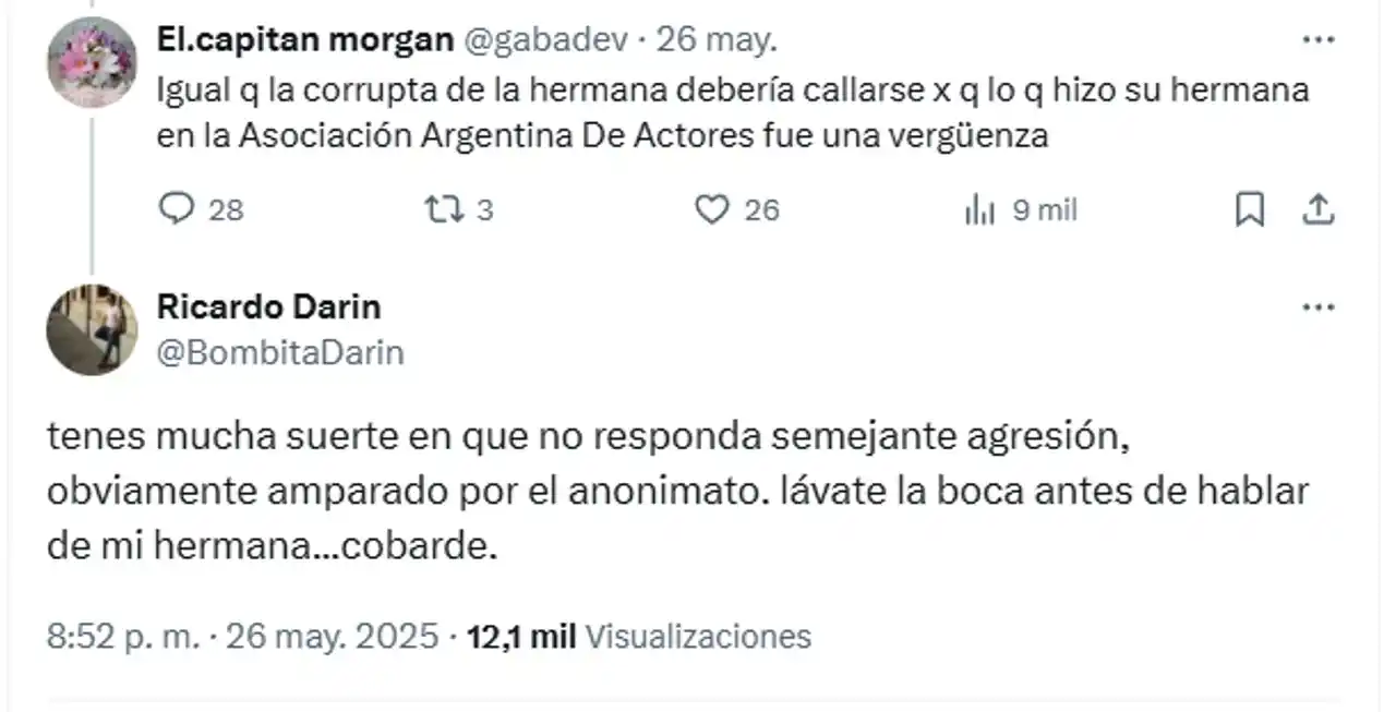 “Tenés mucha suerte en que no responda semejante agresión, obviamente amparado por el anonimato. Lavate la boca antes de hablar de mi hermana, cobarde”, respondió el actor en su cuenta, lo que generó apoyo inmediato de colegas y seguidores.
