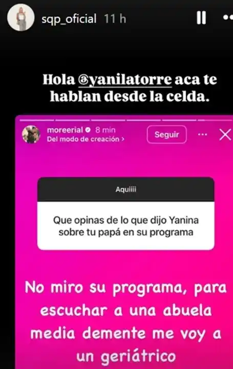 "¿Qué opinás de lo que dijo Yanina Latorre de tu papá en su programa?", le preguntó un seguidor de Instagram a More y ella respondió: "No miro su programa, para escuchar a una abuela media demente, me voy a un geriátrico".