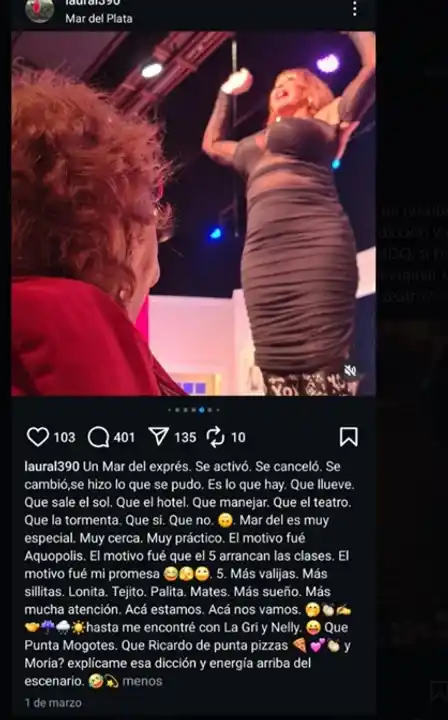 “Un Mardel (Mar del Plata) exprés: se activó, se canceló y se cambió. Se hizo lo que se pudo y es lo que hay: que llueve, que sale el sol, que el hotel, que manejar, que el teatro, que la tormenta, que sí y que no. Mardel es muy especial, muy cerca y muy práctico. Los motivos fueron Aquopolis y que que el 5 arrancan las clases”, había escrito la mujer en sus redes, donde también elogió a Moria Casán, a quien fueron a ver en su espectáculo.