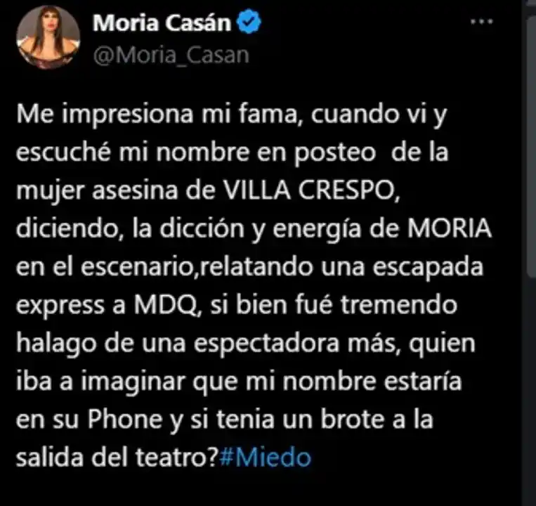 Al enterarse que la mujer la había nombrado, Moria publicó un mensaje en su cuenta de X, donde suele expresar sus opiniones sobre temas de actualidad: "Me impresiona mi fama, cuando vi y escuché mi nombre en posteo de la mujer asesina de Villa Crespo, diciendo, la dicción y energía de Moria en el escenario, relatando una escapada express a MDQ, si bien fue tremendo halago de una espectadora más, quien iba a imaginar que mi nombre estaría en su Phone y si tenía un brote a la salida del teatro? #Miedo".