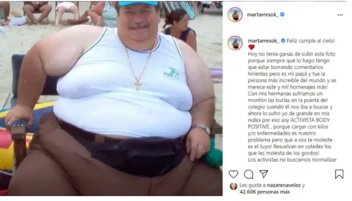 “¡Feliz cumple al cielo! Hoy no tenía ganas de subir esta foto porque siempre que lo hago tengo que estar borrando comentarios hirientes, pero es mi papá y ¡fue la persona más increíble del mundo y se merece este y mil homenajes más! Con mis hermanas sufríamos un montón las burlas en la puerta del colegio cuando él nos iba a buscar y ahora lo sufro yo de grande en mis redes, por eso soy activista body positive, porque cargar con kilos y/o enfermedades es nuestro problema, ¡pero que a vos te moleste es el tuyo! ¡Resuelvan en ustedes los que les molesta de los gordos!”, escribió en la red social.