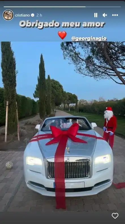Cristiano ha compartido con sus más de 523 millones de seguidores de Instagram una imagen del último regalo que le ha recibido de Georgina, un Rolls Royce envuelto en un gran lazo rojo. Un nuevo vehículo que se une así a la ya densa colección que posee el futbolista y que tanto ha presumido a lo largo de los últimos años, con modelos tan exclusivos como el Bugatti Centodieci, valorado en ocho millones de euros.