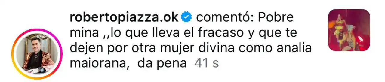 Entre ellos, destaco el comentario que el polémico diseñador Roberto Piazza dejó en un posteo de Instagram: “Pobre mina, lo que lleva el fracaso y que te dejen por otra mujer divina como Analía Maionara, da pena”.