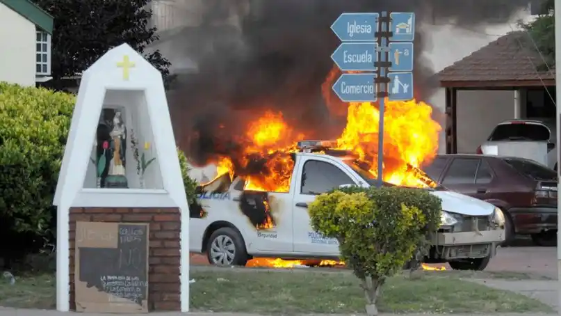 El diario La Arena dijo que son dos los patrulleros incendiados durante los disturbios. Además los manifestantes realizaron pintadas con aerosol y se rompieron algunos vidrios de la comisaría por las pedradas.
