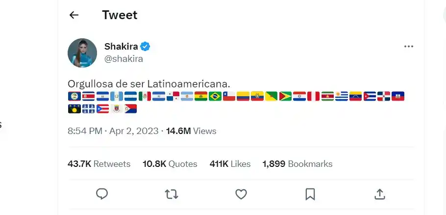 Ante eso, la colombiana publicó un posteo en su cuenta de Twitter donde expresó: “Orgullosa de ser latinoamericana”. Su tuit recibió una gran cantidad de comentarios de apoyo por parte de sus fanáticos quienes se mostraron “orgullosos” por sus palabras.