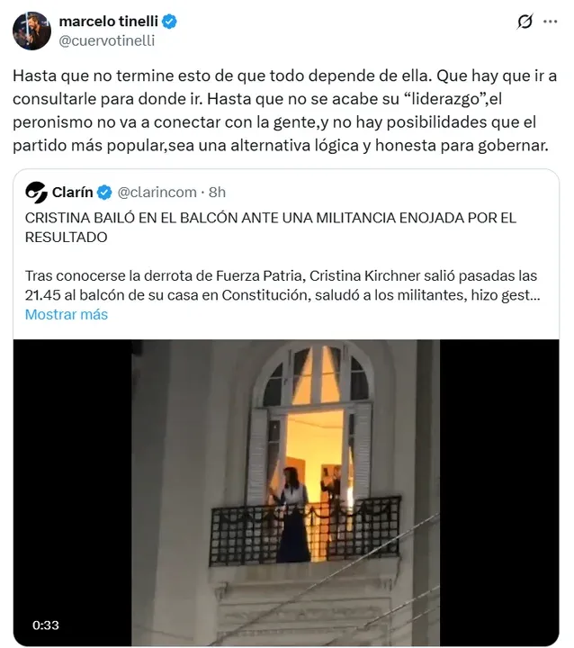 “Hasta que no termine esto de que todo depende de ella. Que hay que ir a consultarle para donde ir. Hasta que no se acabe su 'liderazgo', el peronismo no va a conectar con la gente, y no hay posibilidades que el partido más popular, sea una alternativa lógica y honesta para gobernar”, escribió.