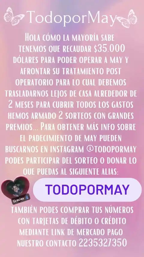 A través de la campaña #TodoporMay, familiares organizaron dos rifas solidarias que difundieron por redes sociales. “Estamos sorteando nuestro auto con el objetivo de acercarse al monto necesario para la operación", contó Micaela.