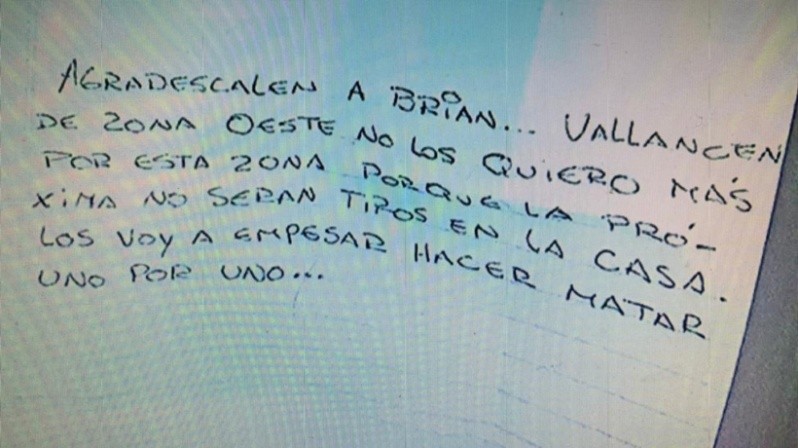 “Agradézcanle a Brian, váyanse de zona oeste, no los quiero más por esta zona porque la próxima no serán tiros en la casa. Los voy a empezar a hacer matar uno por uno”, se lee en la nota que dejaron en la vivienda este domingo pasadas las 21. Al momento del hecho, no había nadie en la casa.