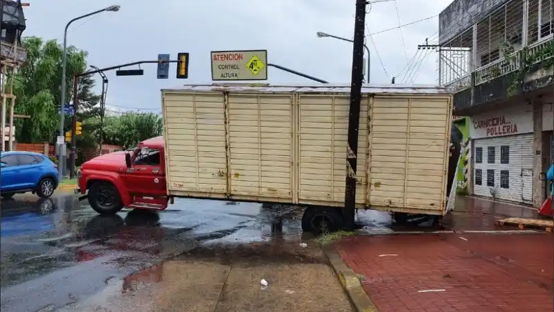 Ocurrió en el mediodía de este lunes, cuando el vehículo hacía maniobras de descarga. El rodado de gran porte quedó apoyado sobre un poste con cables de servicios y una mujer intercedió para evitar más daños. El tránsito estaba interrumpido parcialmente