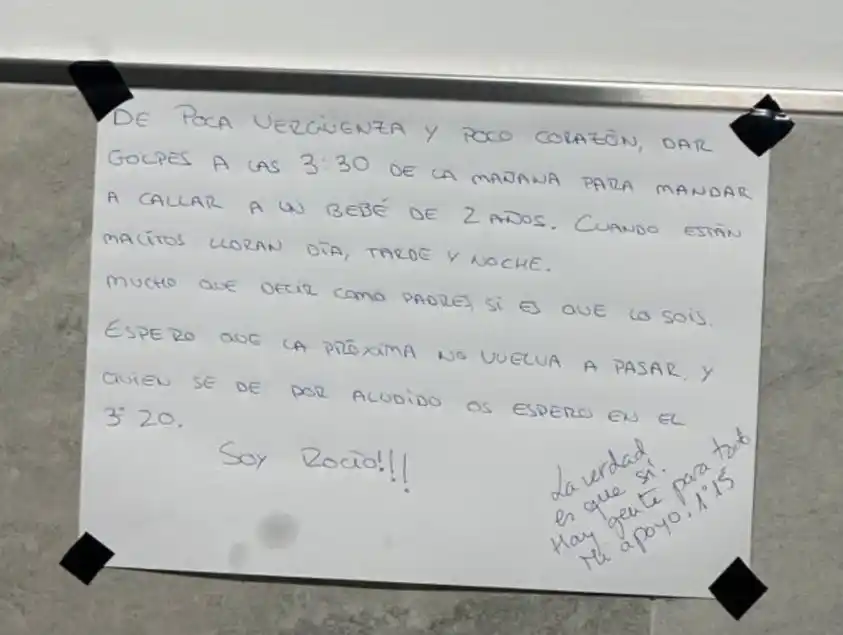 La nota de Rocío no solo llamó la atención del vecino en cuestión, sino que también generó una ola de apoyo entre otros residentes del edificio. Un habitante del primer piso añadió su propio mensaje de respaldo en el mismo papel, afirmando que “hay gente para todo” y mostrando su solidaridad con la madre afectada. Este gesto de apoyo refleja una comunidad dividida entre quienes entienden las dificultades de criar a un niño pequeño y aquellos que priorizan su tranquilidad.