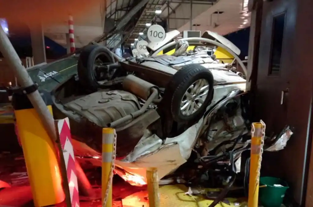 Enseguida, el Fiat también impactó contra una de las cabinas de peaje y terminó volcando.