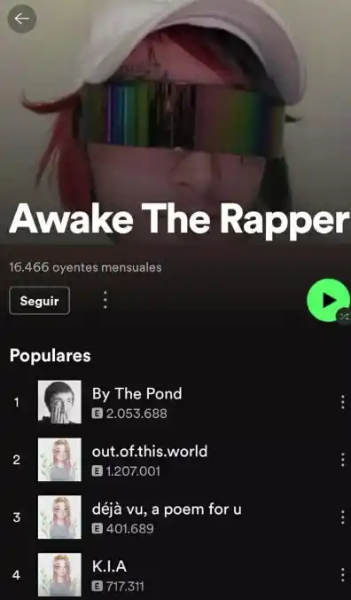 Su nombre artístico es Awake The Rapper y sus temas son públicos desde 2017. En Spotify tiene 16.466 oyentes mensuales y su mayor éxito, By The Pond, acumula más de dos millones de reproducciones.