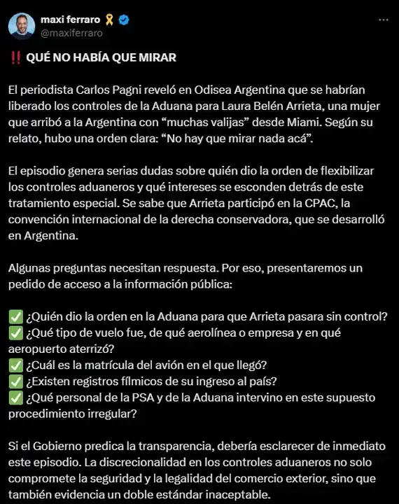 “QUÉ NO HABÍA QUE MIRAR”, tituló Ferraro el extenso mensaje en redes. En la misma línea, hizo eco de la denuncia de Carlos Pagni en Odisea Argentina, sobre la supuesta liberación de controles tras su arribo desde Miami.