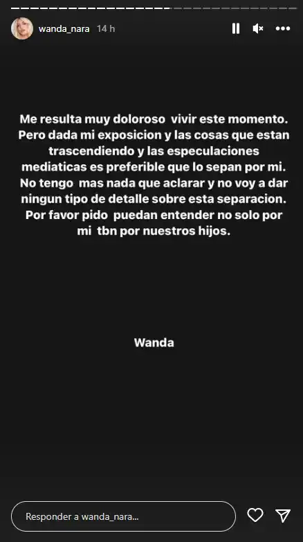 Wanda Nara confirmó este jueves oficialmente su separación de Mauro Icardi a través de un mensaje que publicó en sus historias de Instagram.
